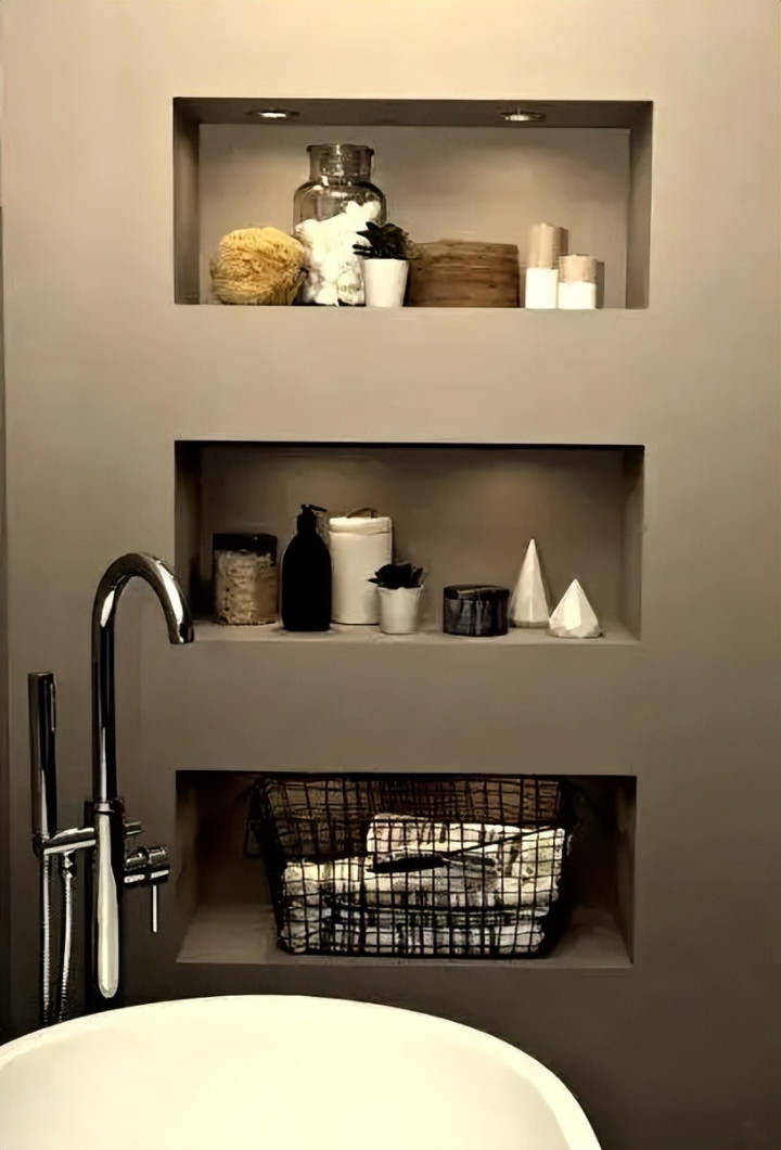 灯光点缀:如果条件允许,在壁龛顶部嵌入一条低压防水灯带。打开后,不仅找东西一目了然,光影层次还能瞬间提升卫生间的氛围,堪比星级酒店。