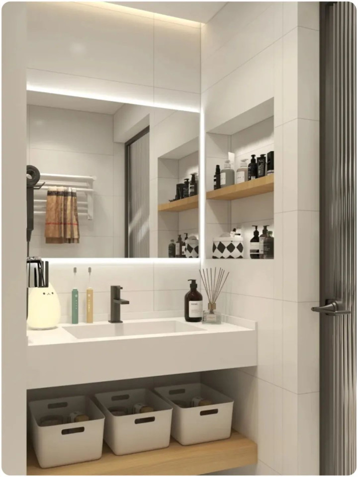 取用超级顺手:洗澡时用的沐浴露、洗发水放在淋浴区的壁龛里;洗脸用的放在洗手台旁的壁龛里,动作流畅,幸福感倍增。